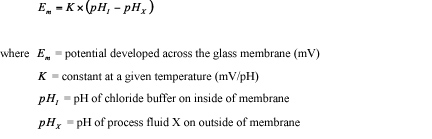 When the surface of silicate glasses containing alkali metals such as lithium contact water, the alkali metals undergo an ion-exchange reaction. In this process, an alkali metal ion from the glass goes into solution and a hydrogen ion takes its place in the glass matrix. It is this reaction at the glass surface that results in the development of an electrical potential at the phase boundary. By designing the measurement half-cell such that the membrane of this special glass is simultaneously exposed to the process fluid on the outside and a chloride buffer of constant pH on the inside as shown in the above figure, the overall potential developed across the membrane is: